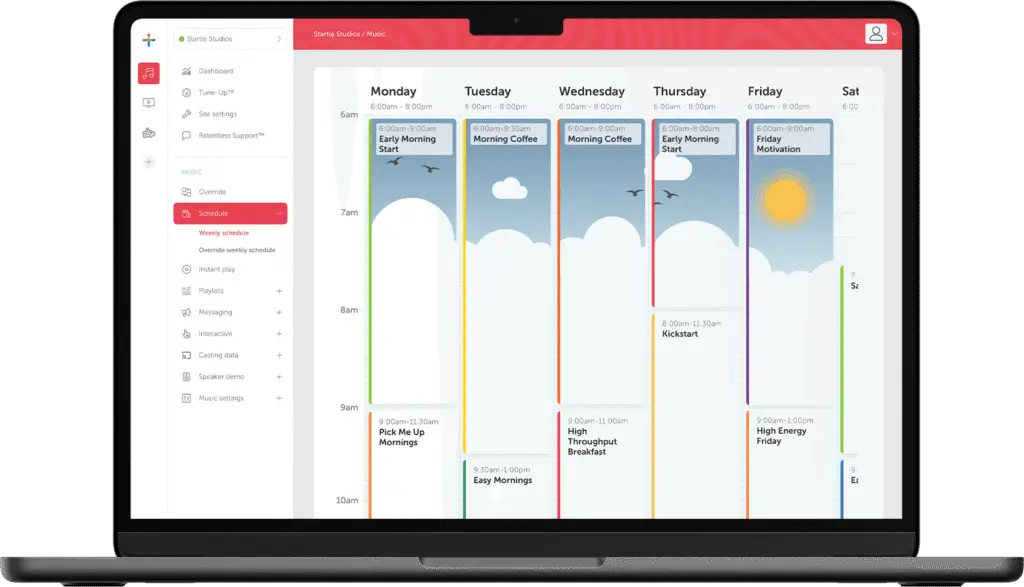 With our user-friendly platform, Studio, designed for enterprise businesses, you can manage music across multiple locations simultaneously. Our simple drag-and-drop scheduling tool makes it easy to tailor music to different times of day and trading patterns. Set your opening and closing hours, schedule your playlist volume and EQ levels, as well as the ability to quickly and easily override your schedule if needed, for those unexpected moments.