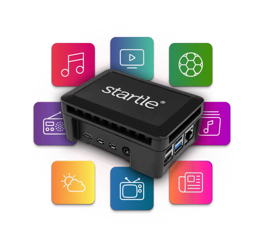 The Startle Player was designed to manage your audio in an energy efficient and highly secure way. It supports HDMI, 3.5 mm, Sonos, and Chromecast connections, and employs mesh networking for seamless synchronisation, auto‑configuration, and efficient bandwidth use across multiple players.